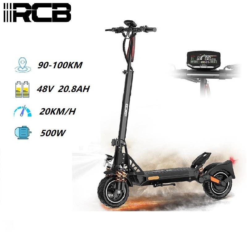 the RCB D5 electric scooter is designed for exploration and off-road riding. D5 electric scooter is equipped with double suspension system, 10 inch wheels and wider pedals. It makes it easier for you to complete daily trips and treat all kinds of road conditions with ease!