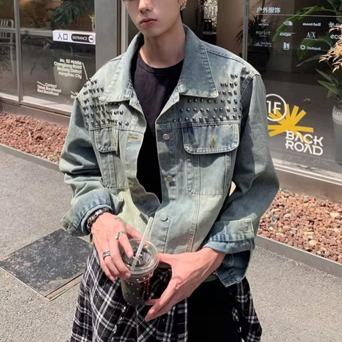 Retro washed rivet design with a lapel denim jacket, men's loose casual versatile jacket