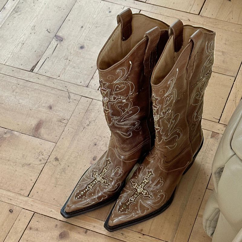 Cowhide Version~ Pointed Toe Embroidered Western Cowboy Boots 2025 Summer New Slimming Rivet Hot Girl Long Boots for Women