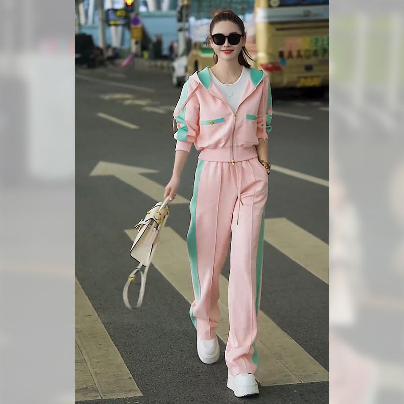 Rosa Casual Spors Syle Zweiteiler für Damen Frühling Neue koreanische Version Reißverschluss Kapuzenpullover Jacke Weitbeinige Hosen
