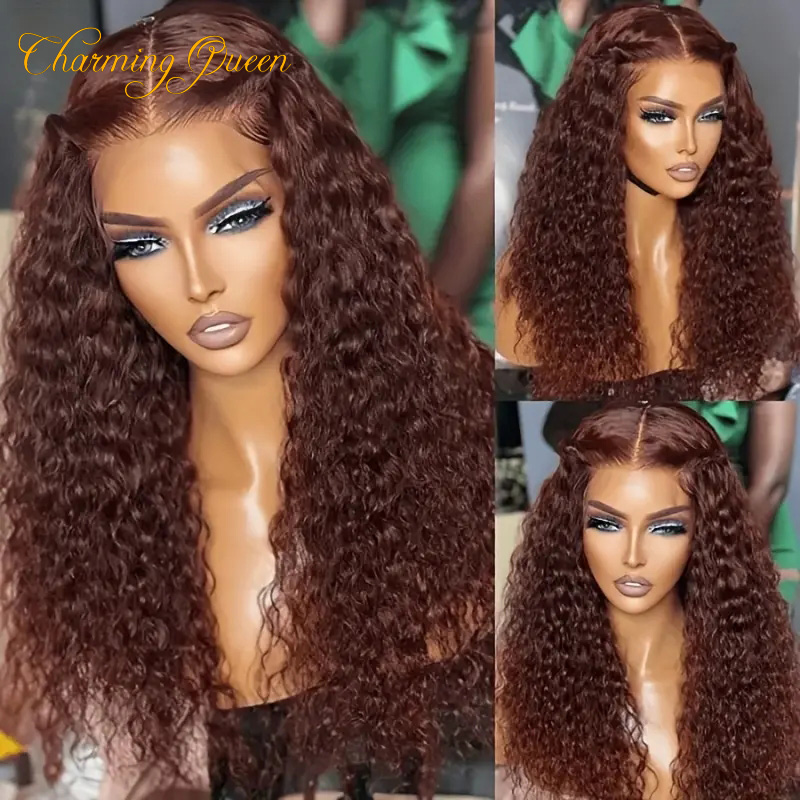 Rotbraune lockige Perücken aus Echthaar, 150 % Dichte, unbehandeltes, lockiges, gewelltes, tiefes Scheitel-Spitze-Perücken, vorgezupftes Babyhaar
