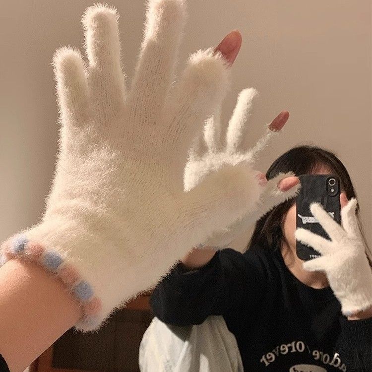 Cute Candy Bean Dew Finger Touchscreen Plush Five Finger Gloves for Women in Winter Warm and Thick Plush Cycling Students