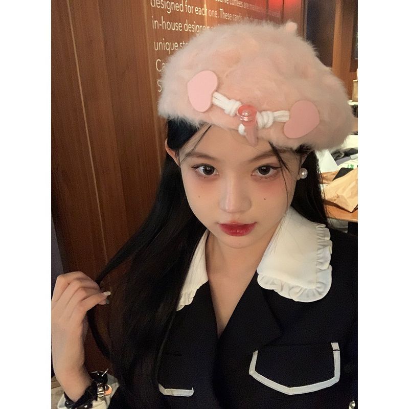 Süße und niedliche Baskenmütze mit herzförmiger Hornschnalle und Kaninchenhaar für Damen, großer Kopfumfang im Winter, veränderte Gesichtsform