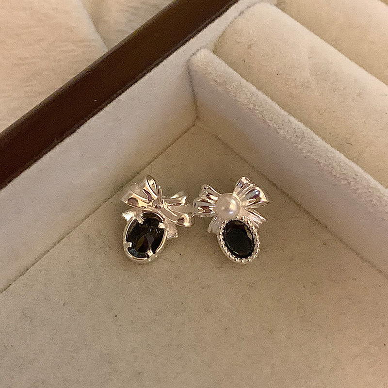 S Pure Silver Bow Pearl Personalized Black Elliptical Zircon Earrings 2023 New Trendy Design Feeling Small and Unique