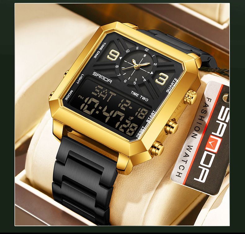 SANDA Square Dual Display Uhr Herren Elektronische Quarz Dual Bewegung 3ATM Wasserdicht Nachtlicht Sport Business Uhr
