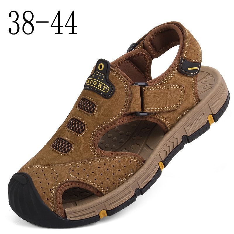 Sandals for men's new summer leather soft sole with a toe cap and thick sole for anti slip trend. Velcro outdoor dad beach shoes