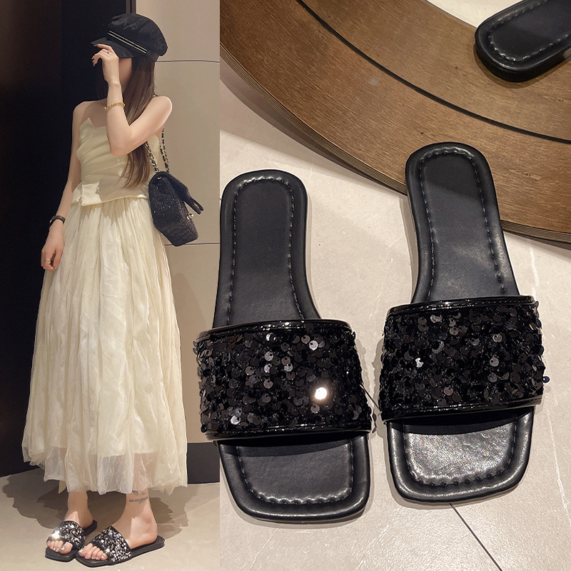 Simple and sparkling sequin outdoor beach flat bottomed slippers for spring 2024 casual anti slip oversized flip flops