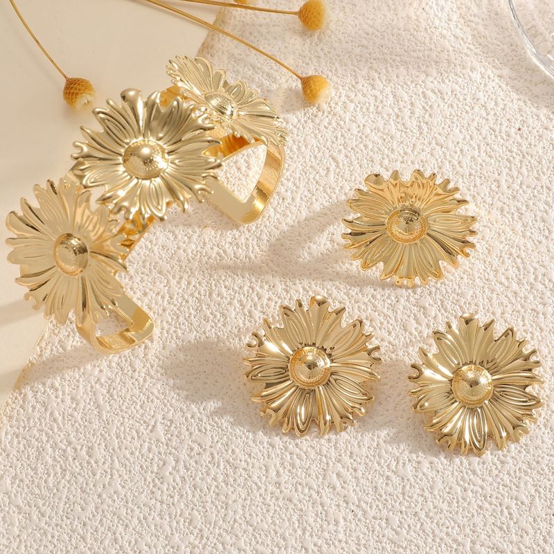 Schmuckset Goldschmuckset Damenschmuckset Extravagante Faltenstruktur Sonnenblumenarmband Ring Ohrring Design Sinn Licht Luxus Schmuckset Thr