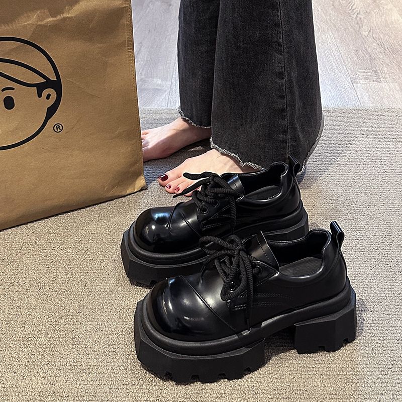 Schwarze JK-Leder-Loafer mit dicker Sohle und großen Zehen, Schnürschuh, Derby-Schuhe im britischen Stil, Frühling/Herbst, Einzelschuhe für Damen