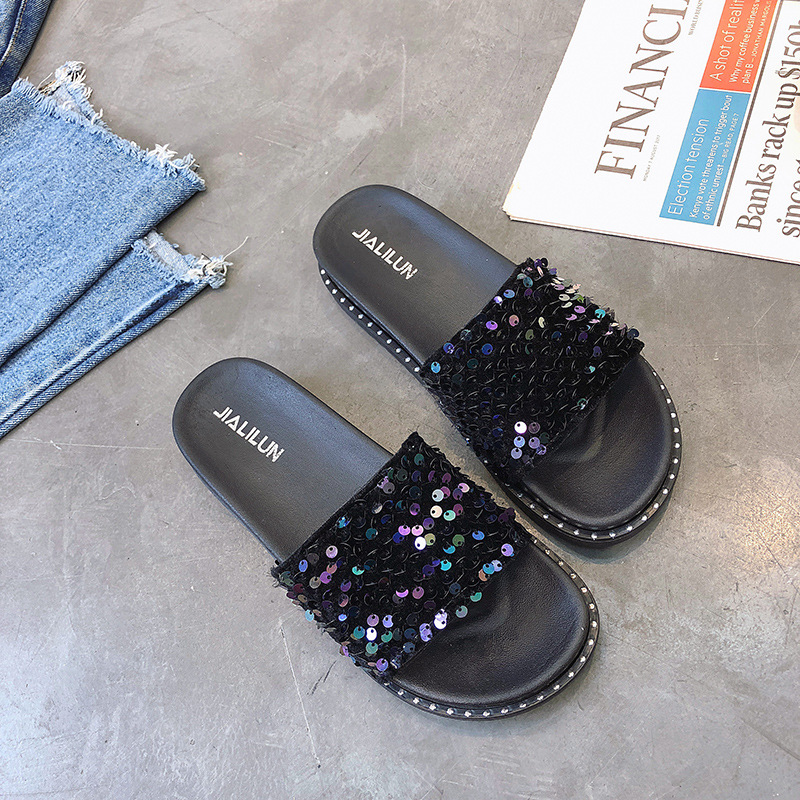 Pailletten-Mode-Hausschuhe für Damen, Sommer, koreanische Muffin-Schuhe mit dicken Sohlen, Oberbekleidung im neuen Stil, koreanischer flacher Boden, einzeilige Hausschuhe, Studenten