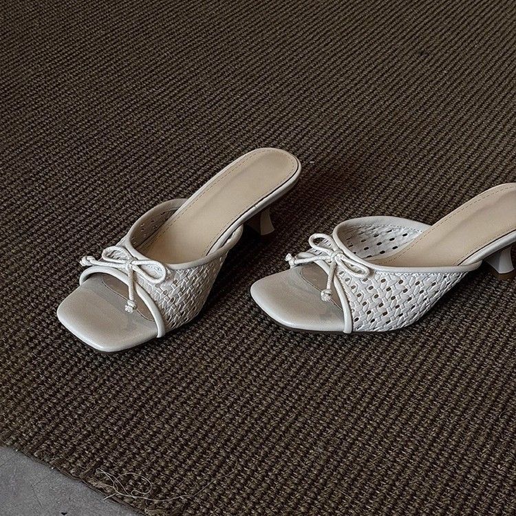 Schaffell-Version ~ Gewebte Hohlsandalen im Urlaubsstil für Damen, vielseitige High Heels mit Schleife und einem Riemen, offener Zehenpartie und quadratischer Zehenpartie