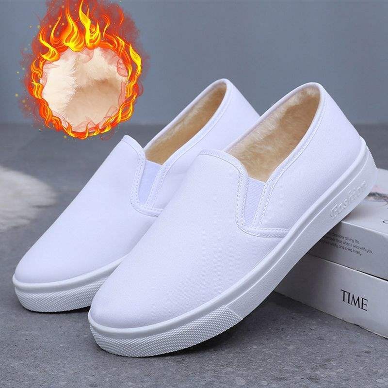 ShoeGlobe Krankenschwesterschuhe für Damen und Herren, rutschfeste, fleecegefütterte, warme Baumwollschuhe mit weicher Sohle, weiße Schuhe, Slip-On Old North Arbeitsschuhe aus Stoff für