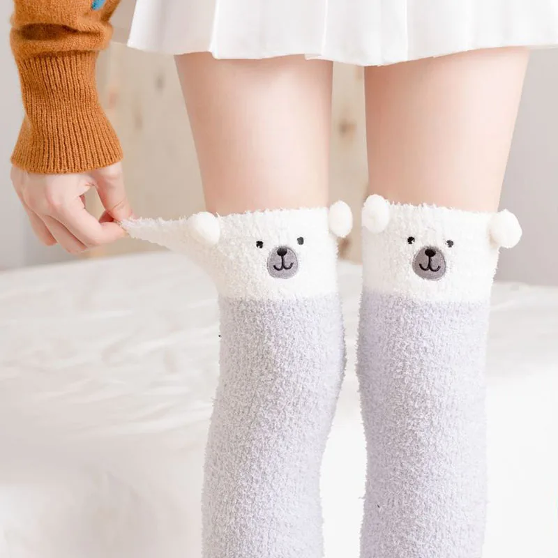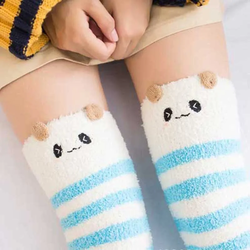 Weiche Korallen Fleece Knie Winter Warme Mädchen Frauen Niedlichen Cartoon Tier Strumpf Gestreiften Gemütliche Lange Oberschenkel Hohe Socke