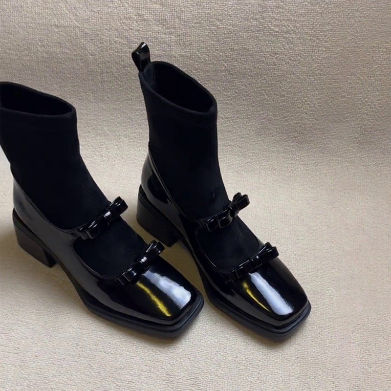 Soft Leather Version~ Square Toe Retro Bow Elastic Slim Boots Patchwork Mary Jane Sock Boots Slimming Chunky Heel Short Boots for Women