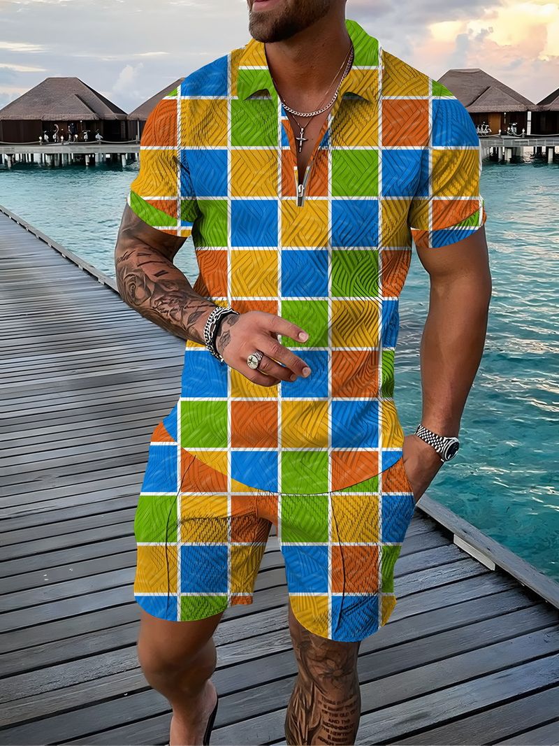 2022 New Creative Short Sleeve Colorful Plaid Element Print Summer Loose Short Sleeve Shorts Polo Set