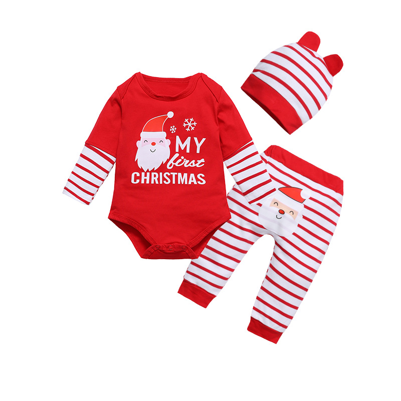 Spring and Autumn Newborn Baby Clothing Children's Christmas Long sleeved Three piece Set Striped Pants Detachable Hat Hoodie Set