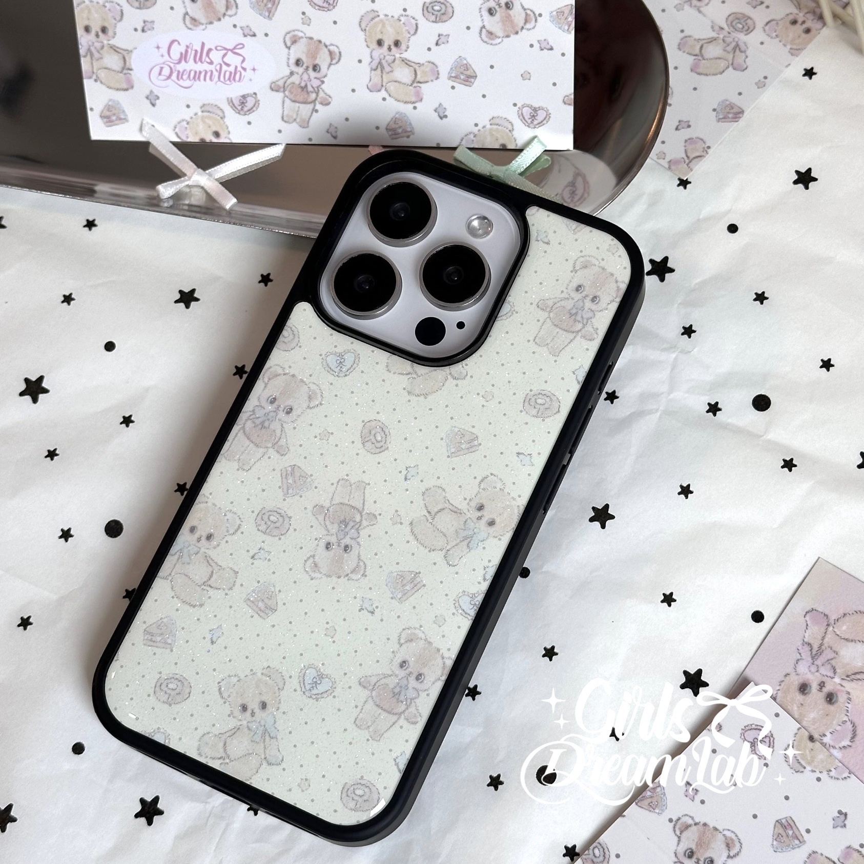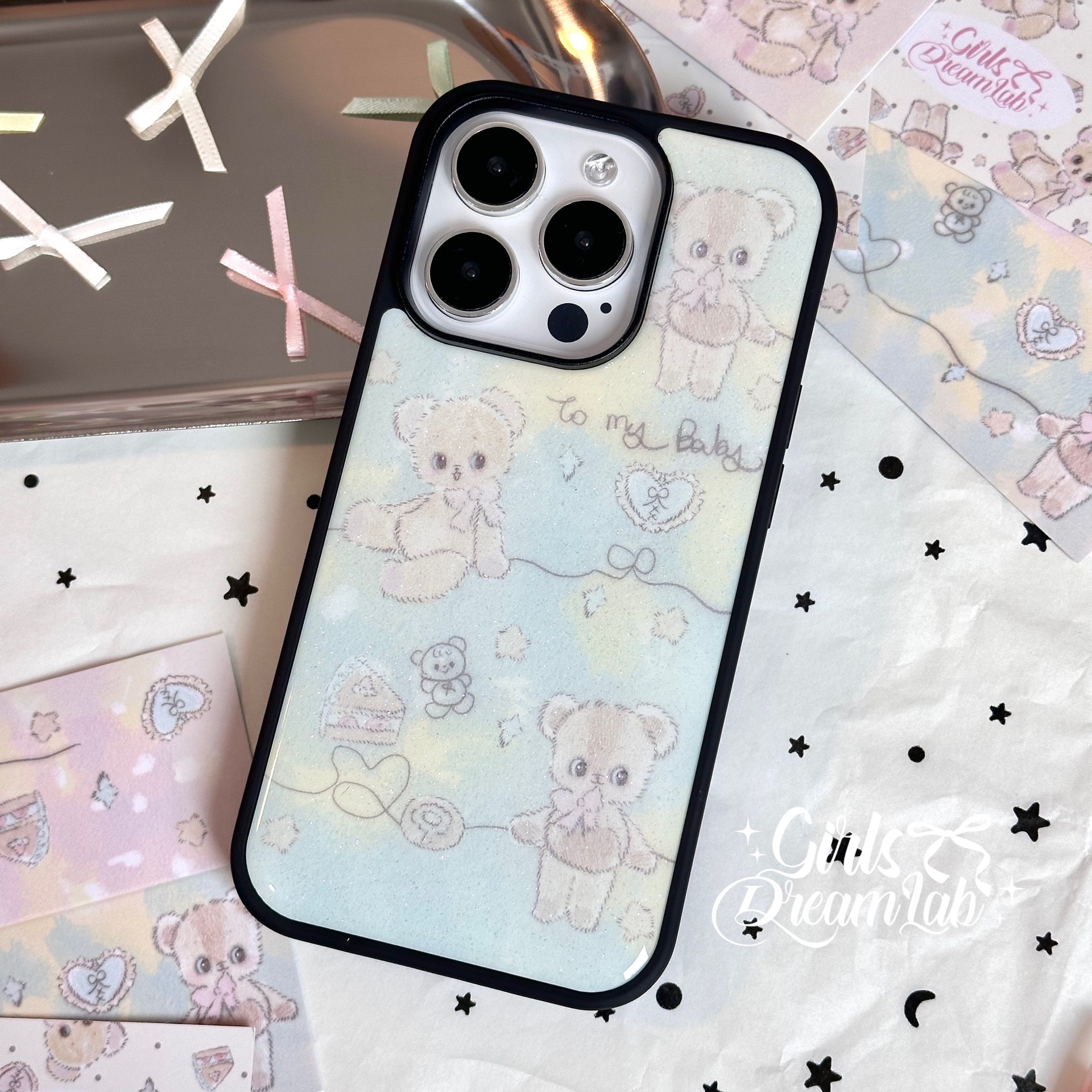 TechGlobe Original Cream Series Plüschbär, Epoxidharz, schwarzer Rahmen, rosa-blaue, niedliche Handyhülle mit großem Loch für iPhone