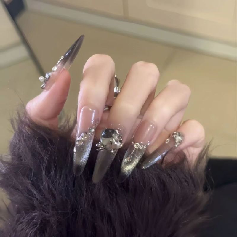Tragen Sie die luxuriöse, glitzernde French Springtime Black Chocolate Cat-Eye-Maniküre der Prinzessin im dunklen und aufhellenden Weiß.