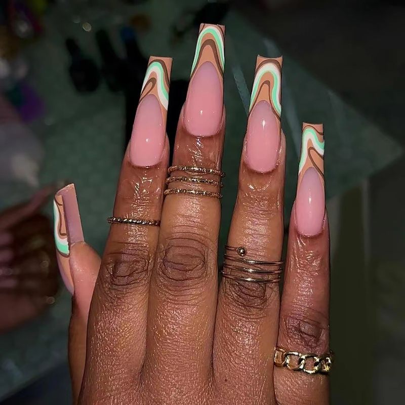 Wearing French striped corrugated nail polish with detachable nail patches press on nail