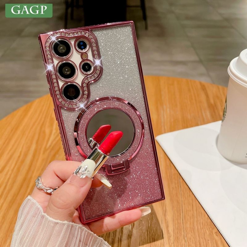 Ultra Cases Mädchen Make-Up Spiegel Magsafe Fall für Samsung Galaxy S24 S23 S22 Plus Bling Diamant Falten Halterung Fundas_voghion.com