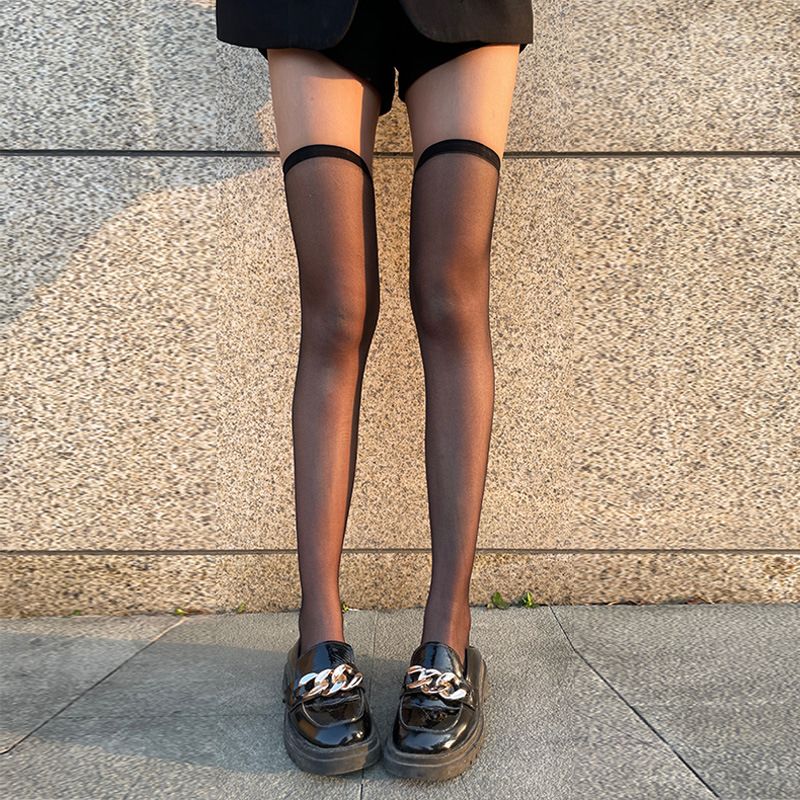 Ultradünne JK-Overknee-Socken aus schwarzer Seide, Sommer, sexy Spice Girls, lange Oberschenkelstrümpfe, Seidenstrümpfe, schwarze transparente mittellange Socken
