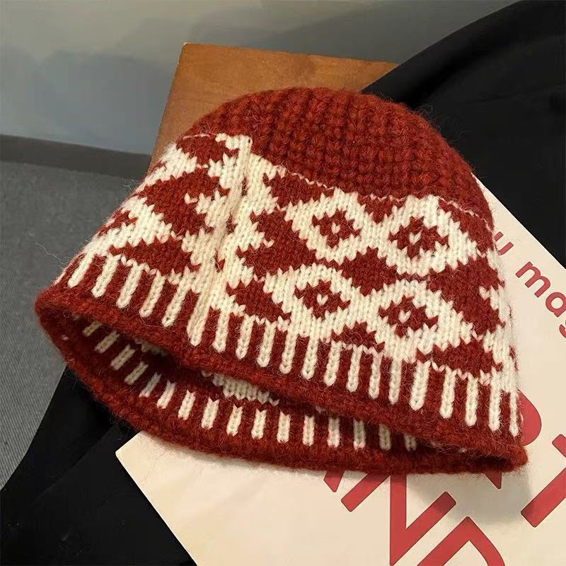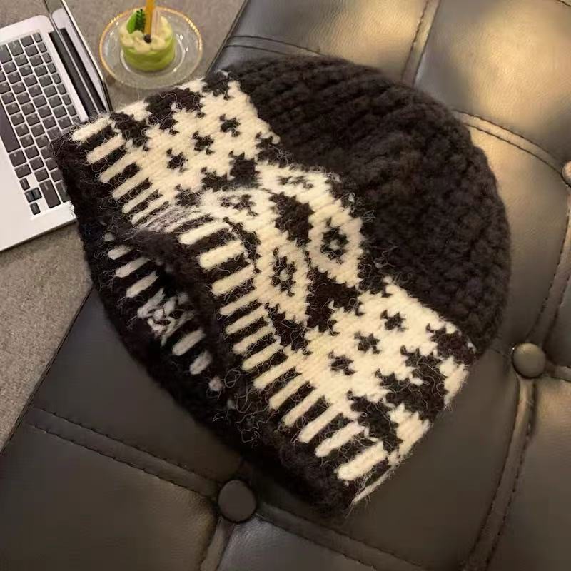 Vintage Black Fisherman Hat He Plaid Knitted Hat for Women Autumn Winter Face Slimming Versatile Large Head Circumference Knitted Hat