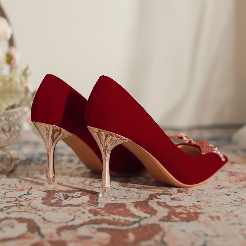Hochzeitsschuhe Xiuhe Hochzeitskleid Zwei trägt Brautschuhe Frühling und Sommer Blume dünne Absätze rote spitze High Heels weiblich
