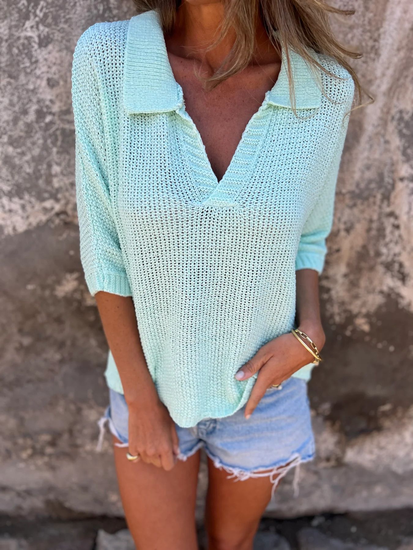 Damen-Sommer-Strickpullover mit Kragen, Dreiviertelärmeln, einfarbig