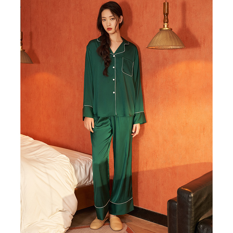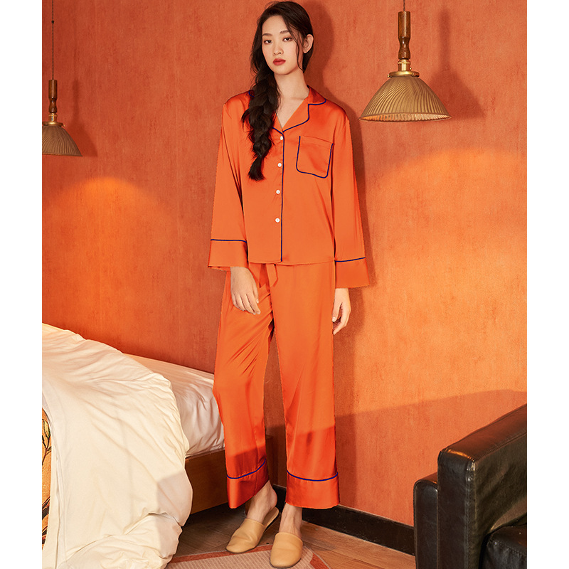 Yaoting Einfacher, lässiger Satin-Chiffon-Pyjama, lange Ärmel und lange Hose, Homewear-Set für Damen, Pama2062